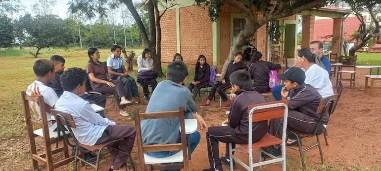 niños dan clases bajo árboles en una escuela rural de Capitán Bado